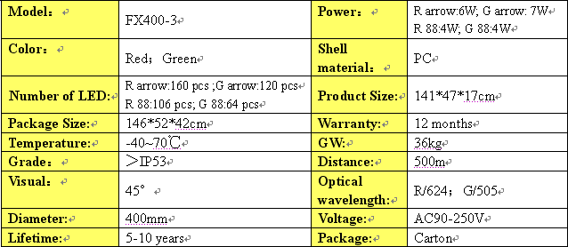 FX400-3-RG an arrow with countdown to a combination of three unit LED traffic lights,ultra-high brightness light-emitting diode chips AlInGaP and InGaN as a product of light, low power consumption, long life, maintaining a reasonable cost of the product.