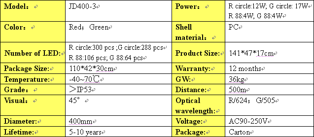 JD400-3-RG three units with full screen countdown combination of LED traffic lights,ultra-high brightness light-emitting diode chips AlInGaP and InGaN as a product of light, low power consumption, long life, maintaining a reasonable cost of the product.
